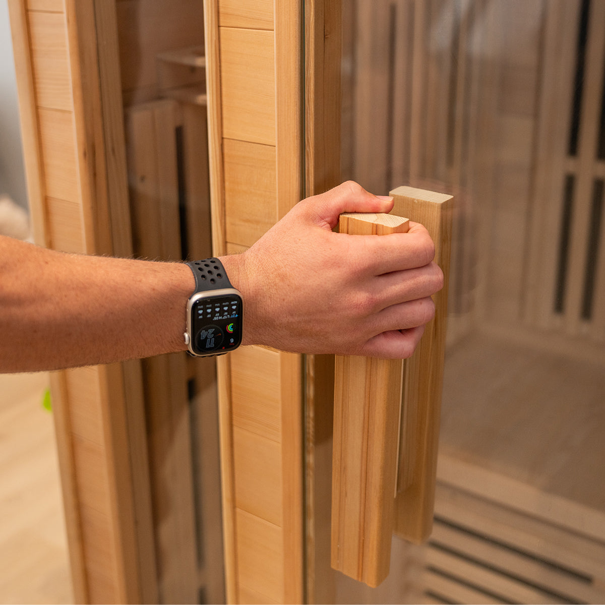 The 8mm tempered glass door adds strength and stability, paired with low-EMF carbon heaters for the safest possible sauna session.
