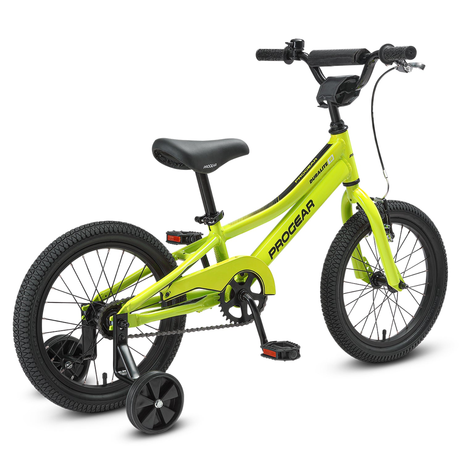 Introducing the DuraLite Boys 16" Bike with a stylish lime green coat, a durable and safe choice for young riders. Built with a sturdy alloy frame and equipped with responsive front and rear calliper brakes, this bike ensures both safety and durability. The fresh lime green colour adds a touch of style while the adjustable seat height and padded saddle provide a comfortable ride. With training wheels included, this 16-inch wheel bike is ideal for children aged 4 to 7. Easy assembly and a focus on safety make this bike a perfect choice for young adventurers to explore their neighbourhood, ride to school and create lasting memories.