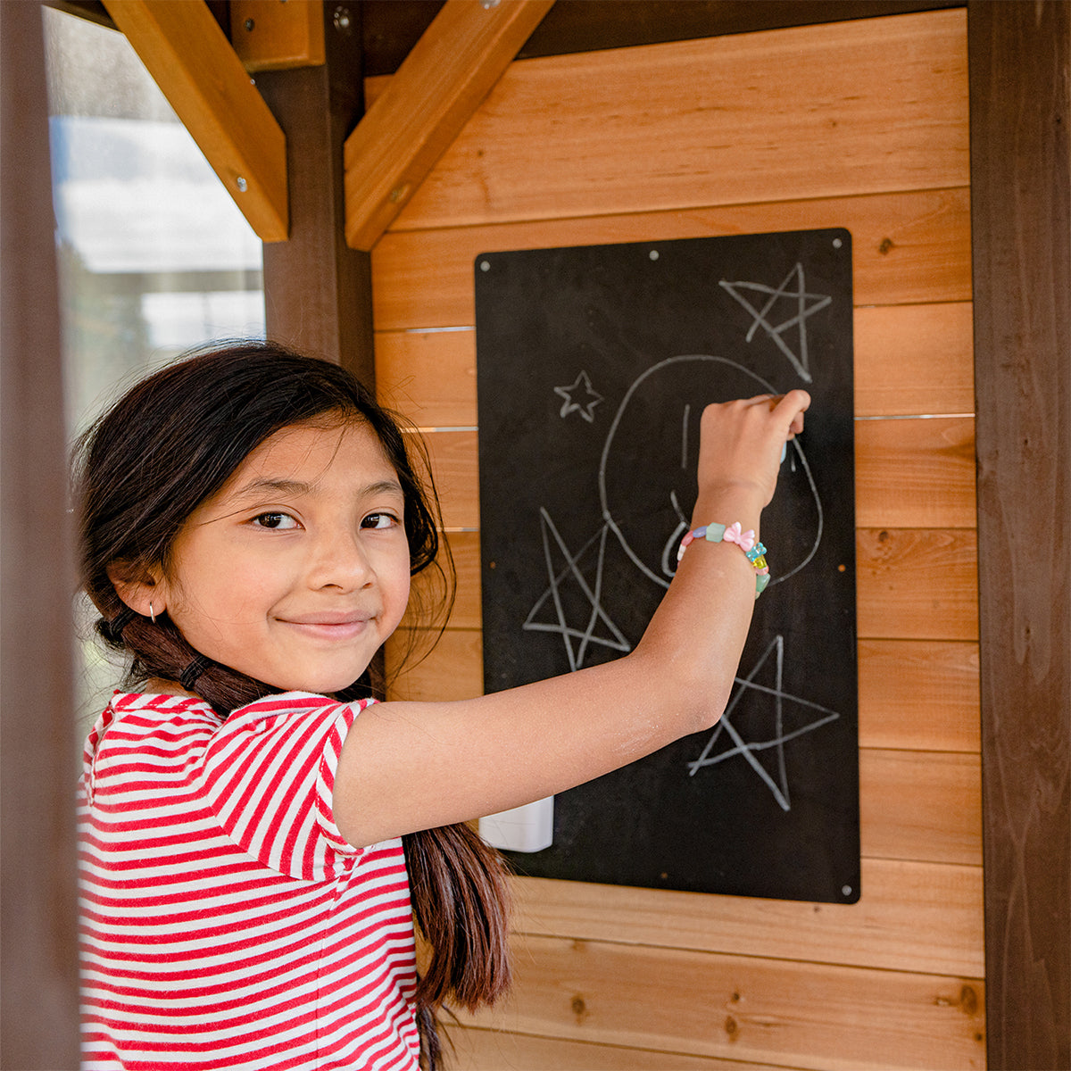 Tucked beneath the lookout tower, the cozy hideaway is a perfect retreat for quiet play and imaginative adventures. This secret nook includes a play kitchen where kids can whip up pretend feasts, and a chalkboard for drawing and games.