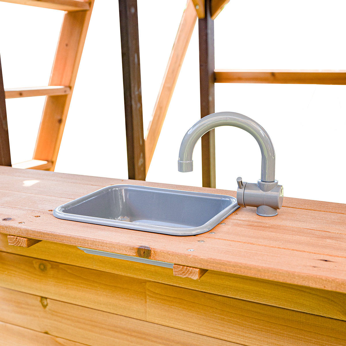 Tucked beneath the lookout tower, the cozy hideaway is a perfect retreat for quiet play and imaginative adventures. This secret nook includes a play kitchen where kids can whip up pretend feasts, and a chalkboard for drawing and games.